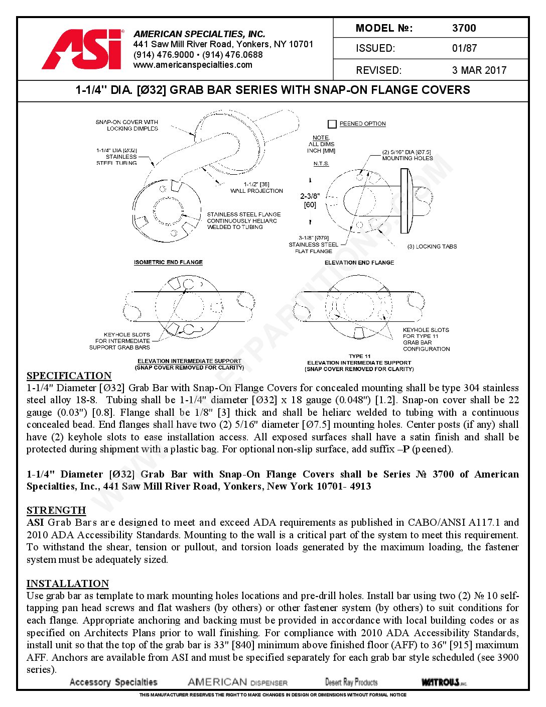 The American Specialties 3701-36P 36" snap flange (1-1/4" O.D.) straight grab bar has a cover that snaps over the mountingThe American Specialties 3701-36P 36" snap flange (1-1/4" O.D.) straight grab bar has a cover that snaps over the mounting...