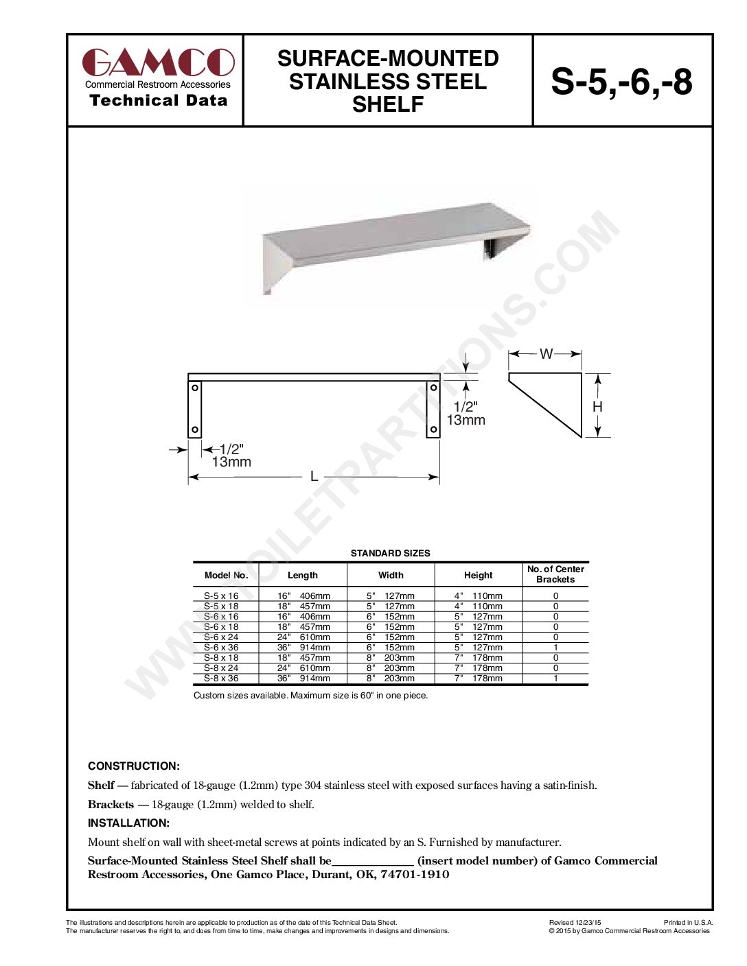Shelf is 5" deep and 16" long. Shelf - fabricated of 18-gauge (1.2mm) type 304 stainless steel with exposed surfacesShelf is 5" deep and 16" long. Shelf - fabricated of 18-gauge (1.2mm) type 304 stainless steel with exposed surfaces...