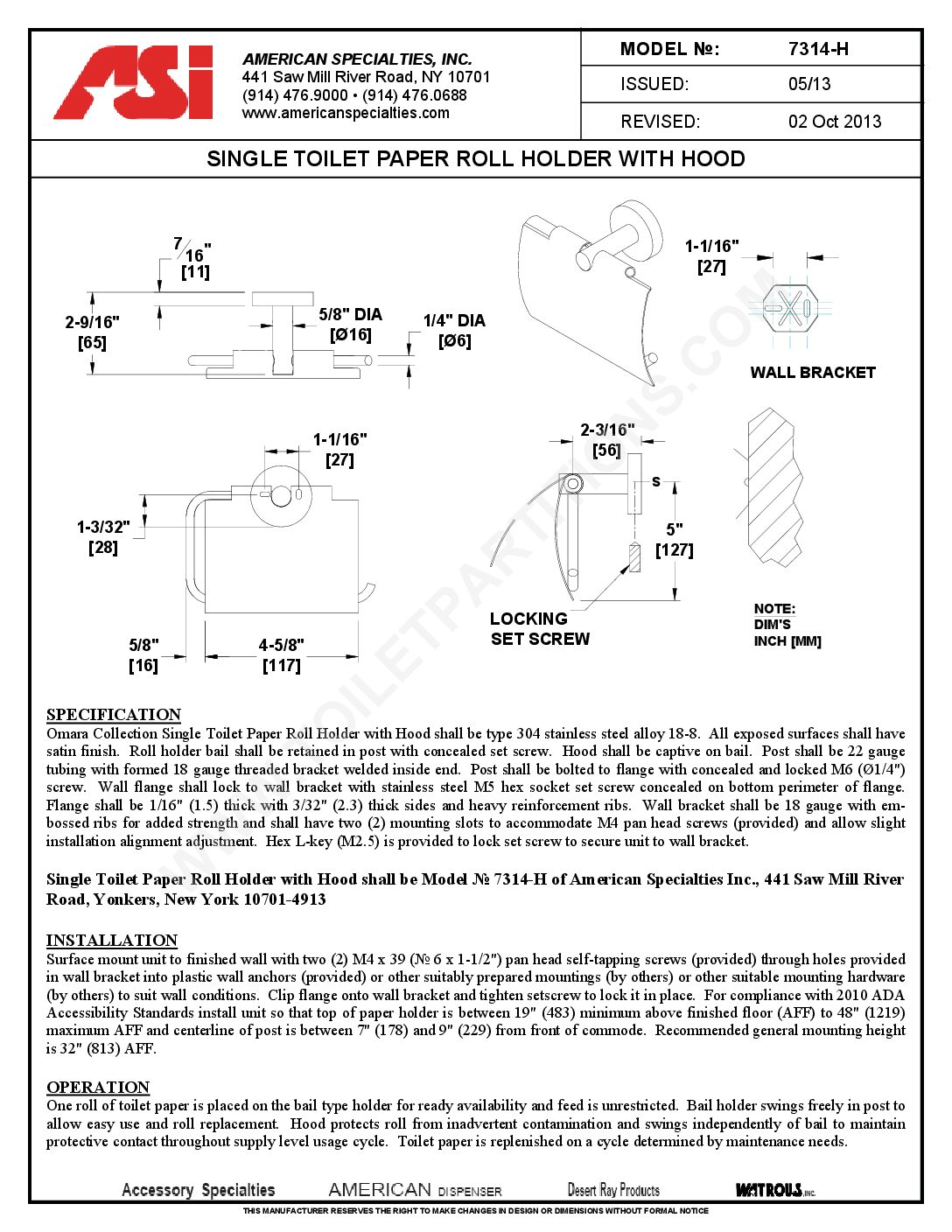 The American Specialties 7314-H is a single toilet paper roll holder with a hood. The hood adds weight for easyThe American Specialties 7314-H is a single toilet paper roll holder with a hood. The hood adds weight for easy...