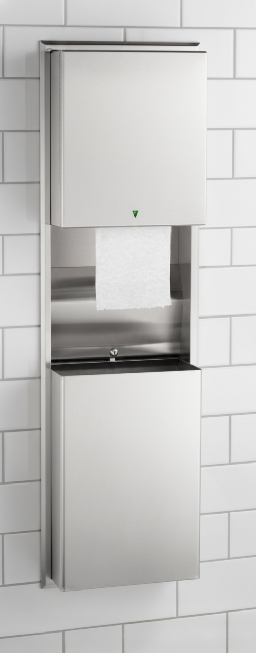 The cabinet is constructed from heavy-gauge 18-8, Type-304 stainless steel with welded construction, while the flange is made of 22-gauge (0.8mm) 18-8, Type-304 stainless steel featuring a drawn and beveled, one-piece, seamless design. The door is fabricated from 20-gauge (0.9mm) 18-8, Type-304 stainless steel with drawn, one-piece, seamless construction and is secured to the cabinet with a full-length stainless steel piano-hinge. All exposed stainless steel surfaces have a satin-finish. The automatic roll towel dispenser mechanism utilizes durable, high-impact resin materials. The waste receptacle is constructed of 22-gauge (0.8mm) 18-8, Type-304 stainless steel with hemmed edges for safe handling. The cabinet, door, and waste receptacle are equipped with tumbler locks keyed like other washroom accessories.