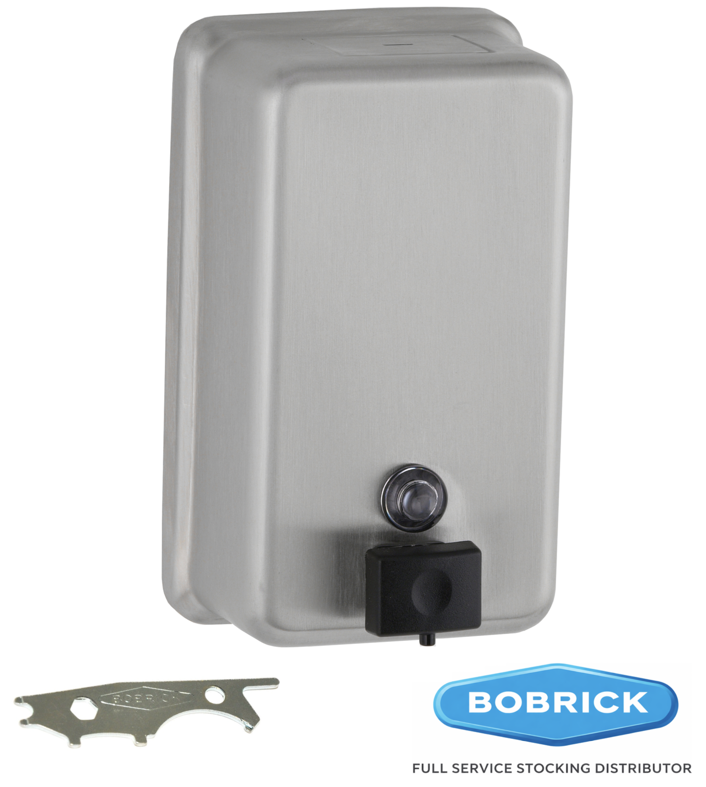 Enhance your restroom with the Bobrick B-40 Manual Soap Dispenser, a sleek and durable wall-mounted solution designed for efficiency and cost savings. Its modern two-tone black and gray design complements any commercial space, while the bulk soap valve helps reduce long-term expenses compared to proprietary cartridges.