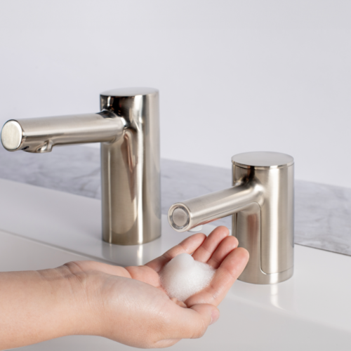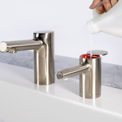 Automatic Fino Collection foam soap dispenser in a contemporary cylindrical design made with diecast zinc spout body. Touch-free dispenser minimizes cross-contamination for hygienic handwashing. Patented top-fill design reduces maintenance time and cost with easy above-counter filling. Dispenses economical bulk jug soap for significant cost-in-use savings and waste reduction. Low Soap Level Indicator informs maintenance when to refill. Adjustable soap control dial addresses patron preferences. New look pairs beautifully with matching Bobrick Fino Collection faucet and is available in five finishes for design continuity: polished chrome, brushed nickel, matte black, brushed brass and polished graphite.