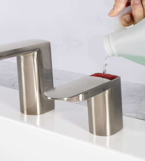 Automatic Fino Collection liquid soap dispenser in a streamlined, modern design made with diecast zinc spout body. Touch-free dispenser minimizes cross-contamination for hygienic handwashing. Patented top-fill design reduces maintenance time and cost with easy above-counter filling. Dispenses economical bulk jug soap for significant cost-in-use savings and waste reduction. Low Soap Level Indicator informs maintenance when to refill. Adjustable soap control dial addresses patron preferences. New look pairs beautifully with matching Bobrick Fino Collection faucet and is available in five finishes for design continuity: polished chrome, brushed nickel, matte black, brushed brass and polished graphite.
