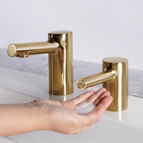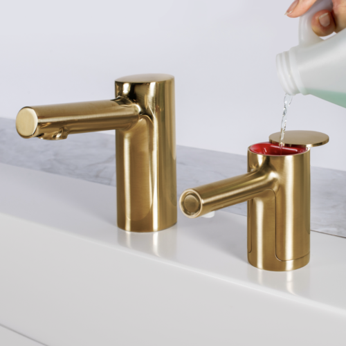 Automatic Fino Collection liquid soap dispenser in a contemporary cylindrical design made with diecast zinc spout body. Touch-free dispenser minimizes cross-contamination for hygienic handwashing. Patented top-fill design reduces maintenance time and cost with easy above-counter filling. Dispenses economical bulk jug soap for significant cost-in-use savings and waste reduction. Low Soap Level Indicator informs maintenance when to refill. Adjustable soap control dial addresses patron preferences. New look pairs beautifully with matching Bobrick Fino Collection faucet and is available in five finishes for design continuity: polished chrome, brushed nickel, matte black, brushed brass and polished graphite.