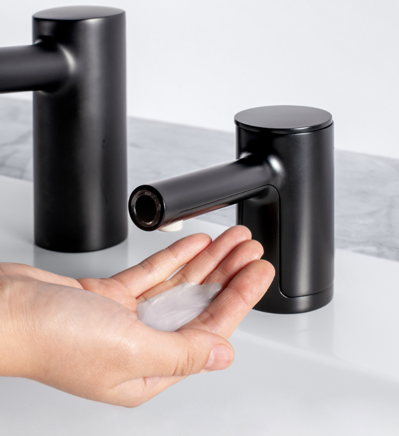 Automatic Fino Collection liquid soap dispenser in a contemporary cylindrical design made with diecast zinc spout body. Touch-free dispenser minimizes cross-contamination for hygienic handwashing. Patented top-fill design reduces maintenance time and cost with easy above-counter filling. Dispenses economical bulk jug soap for significant cost-in-use savings and waste reduction. Low Soap Level Indicator informs maintenance when to refill. Adjustable soap control dial addresses patron preferences. New look pairs beautifully with matching Bobrick Fino Collection faucet and is available in five finishes for design continuity: polished chrome, brushed nickel, matte black, brushed brass and polished graphite.