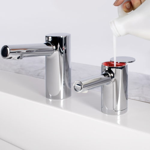 Automatic Fino Collection liquid soap dispenser in a contemporary cylindrical design made with diecast zinc spout body. Touch-free dispenser minimizes cross-contamination for hygienic handwashing. Patented top-fill design reduces maintenance time and cost with easy above-counter filling. Dispenses economical bulk jug soap for significant cost-in-use savings and waste reduction. Low Soap Level Indicator informs maintenance when to refill. Adjustable soap control dial addresses patron preferences. New look pairs beautifully with matching Bobrick Fino Collection faucet and is available in five finishes for design continuity: polished chrome, brushed nickel, matte black, brushed brass and polished graphite.