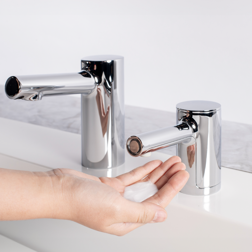 Automatic Fino Collection liquid soap dispenser in a contemporary cylindrical design made with diecast zinc spout body. Touch-free dispenser minimizes cross-contamination for hygienic handwashing. Patented top-fill design reduces maintenance time and cost with easy above-counter filling. Dispenses economical bulk jug soap for significant cost-in-use savings and waste reduction. Low Soap Level Indicator informs maintenance when to refill. Adjustable soap control dial addresses patron preferences. New look pairs beautifully with matching Bobrick Fino Collection faucet and is available in five finishes for design continuity: polished chrome, brushed nickel, matte black, brushed brass and polished graphite.