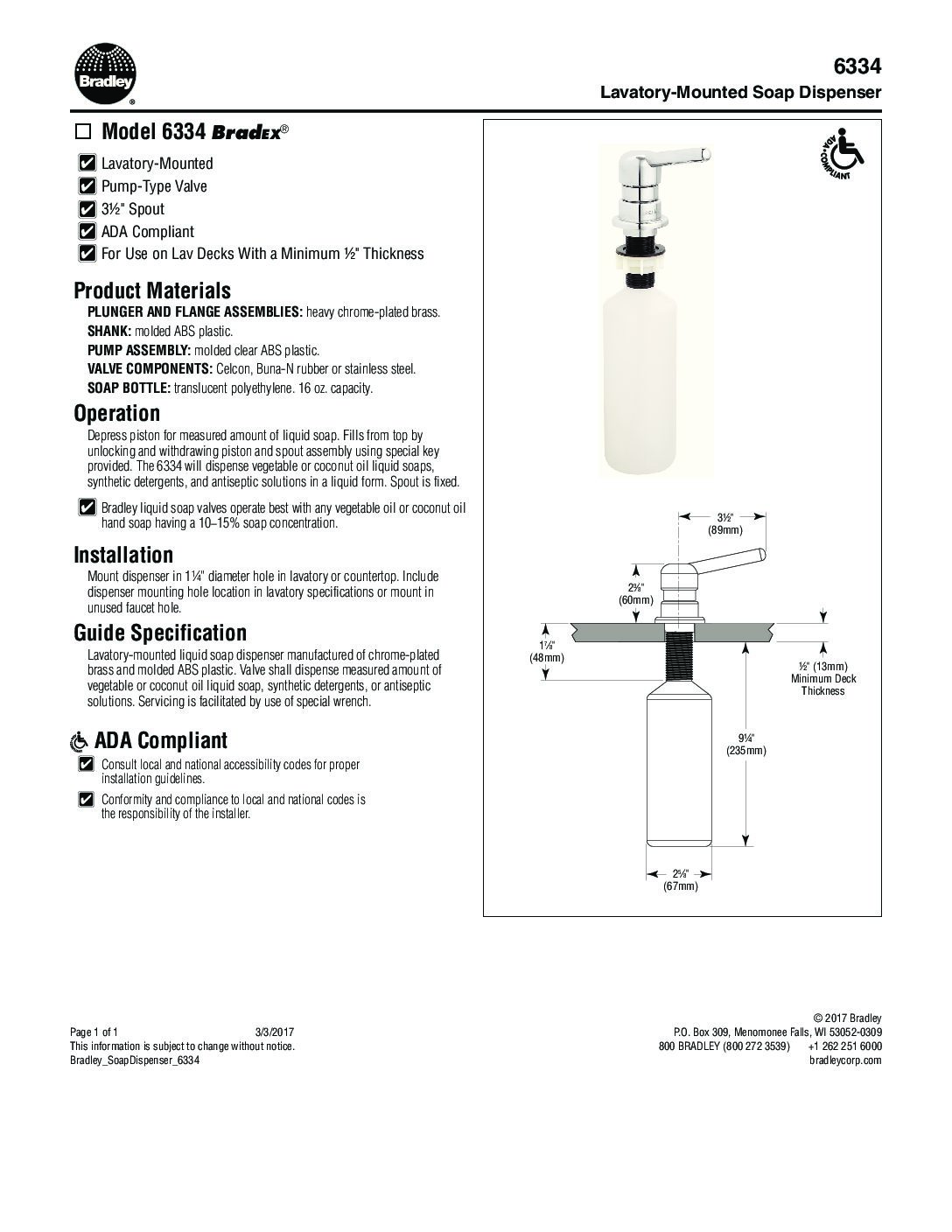 The Bradley 6334 Lavatory-Mounted Soap Dispenser is a drop-in dispenser suited for use in lavatories with sink and counter topThe Bradley 6334 Lavatory-Mounted Soap Dispenser is a drop-in dispenser suited for use in lavatories with sink and counter top...