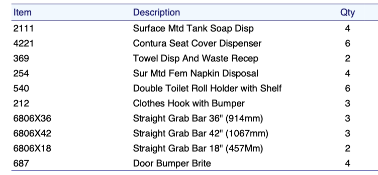 6 stall(s) and 2 screen(s) with Headrail Braced – 12″ [305mm] AFF and 603 Almond, with accessories listed: